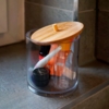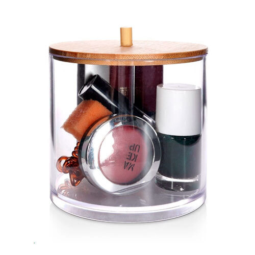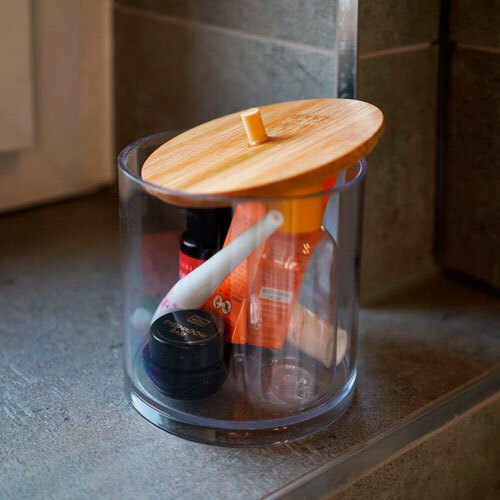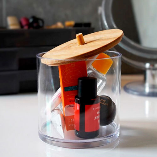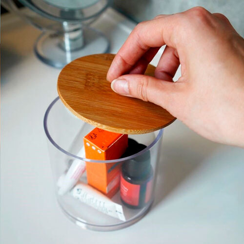 Pladsbesparende Eleganza makeup organizer, der er fremstillet i robust plast med bambus låg og kommer fra Vilde. Kan benyttes til opbevaring af makeup artikler på badeværelset og sikrer, at du altid har disse i nærheden, når de skal bruges. Det simple og minimalistiske design passer ind på ethvert badeværelse.
