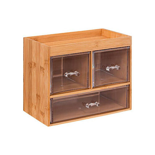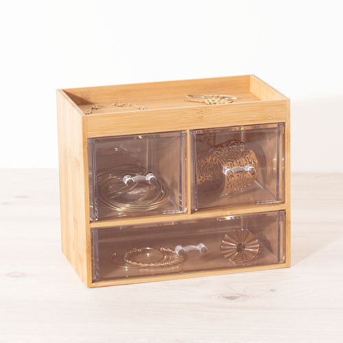 Rummeligt smykkeskrin med tre skuffer, der er fremstillet i bæredygtigt, miljøvenligt og 100% FSC-certificeret bambus med udtræksskuffer i plast. Ideel til opbevaring af smykker og kommer fra franske 5five.