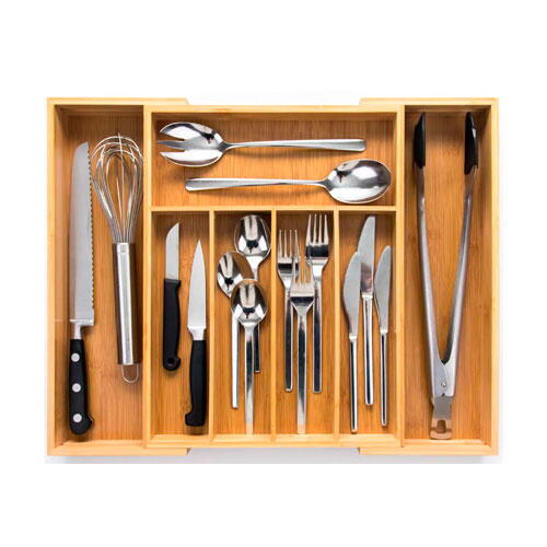 Praktisk og anvendelig bestikbakke, der er fremstillet i bæredygtigt, miljøvenligt og FSC-certificeret bambus. Bestikbakken er justerbar og passer derfor til næsten alle skuffer. Det er muligt at trække de to sider fra hinanden og skubbe dem sammen alt efter behov. Bestikindsatsen er forsynet med 5-7 rum, hvor du kan placere dine knive, gafler, skeer, teskeer og pizzaskærer m.m.