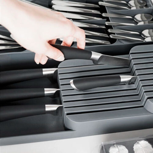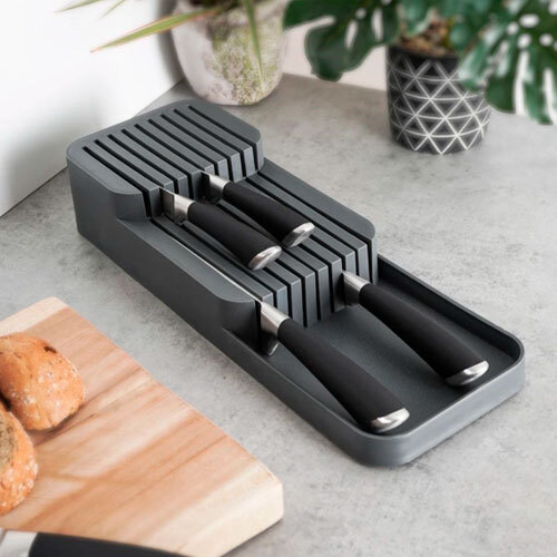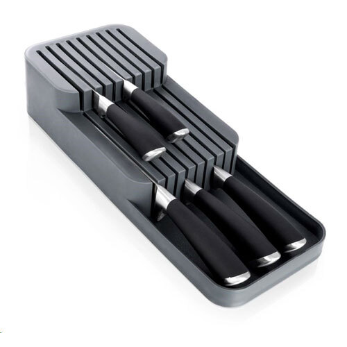 Praktisk knivblok til skuffe, der er fremstillet i robust plastik med grå farve. Yderst praktisk tilføjelse til din køkkenskuffe, hvor du kan få gemt knivene væk fra køkkenbordets overflade og spare plads på selve bordpladen. Holderen er forsynet med 18 huller og passer både til små og store knive. Knive medfølger ikke.