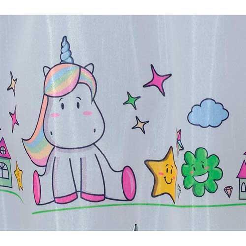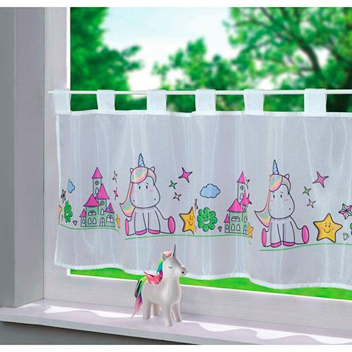 Færdigsyet cafegardin i sjovt design med enhjørninger. Luftigt, hvidt køkkengardin, der er fremstillet i 100% polyester og forsynet med huller til ophæng på gardinstang, der er klar til brug med det samme. Egnet til gardinstænger med en maksimal diameter på 5 cm. Tåler vask ved 40 grader. Testet fri for skadelige stoffer gennem Øko-tex standard 100.