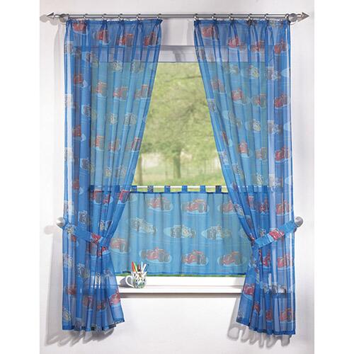 Luftigt gardinsæt til børn med bil motiv af 100% polyester. Underdelen af gardinsættet er forsynet med huller til ophæng på gardinstang, der er klar til brug med det samme. Sidegardinerne er forsynet med huller til gardinkroge og stofholder i begge sider. Der medfølger ikke gardinkroge i sættet. Sættet består af 5 dele, og tåler vask ved 40 grader.