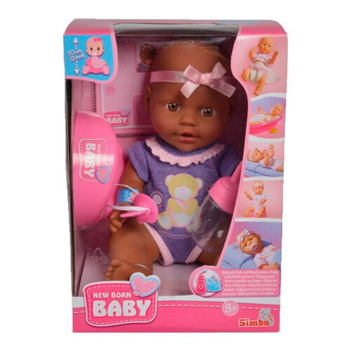 Underholdende New Born Baby med tilbehør til at drikke, bad og toiletbesøg. Her får dit barn en masse timers leg ved at tage sig af dukken, hvor der både medfølger en potte, en sutteflaske og en sut i tilbehøret. Emily kan både drikke og tisse. Egnet til børn, der er ældre end 3 år. Kommer fra tyske Simba.
