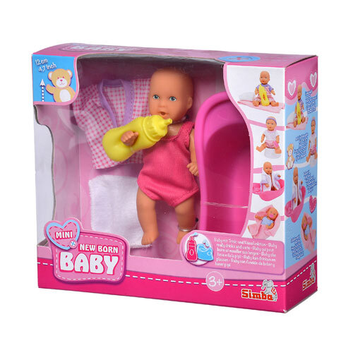 Underholdende New Born Mini Baby med tilbehør til spisning, bad og toiletbesøg. Her får dit barn en masse timers leg ved at tage sig af dukken, hvor der både medfølger en potte, en sutteflaske og et badekar i tilbehøret. Egnet til børn, der er ældre end 3 år. Kommer fra tyske Simba.