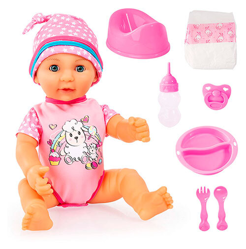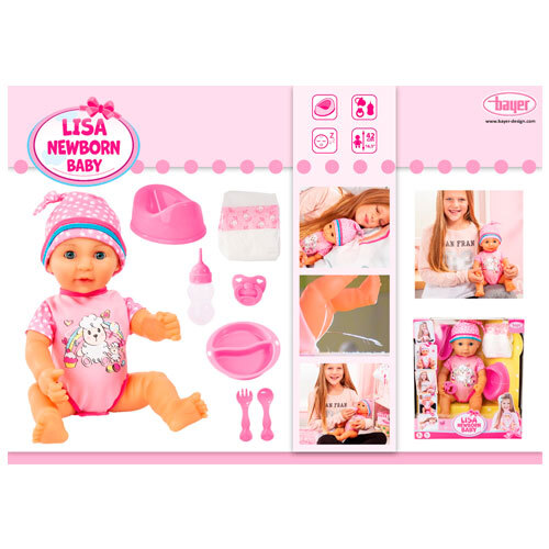 Underholdende Newborn Baby med tilbehør til spisning, bad og toiletbesøg. Her får dit barn en masse timers leg ved at tage sig af dukken, hvor der både medfølger en potte, ble, ske og gaffel, tallerken, sutteflaske og en sut i tilbehøret. Dukken kan drikke og tisse. Egnet til børn, der er ældre end 3 år. Kommer fra tyske Bayer.