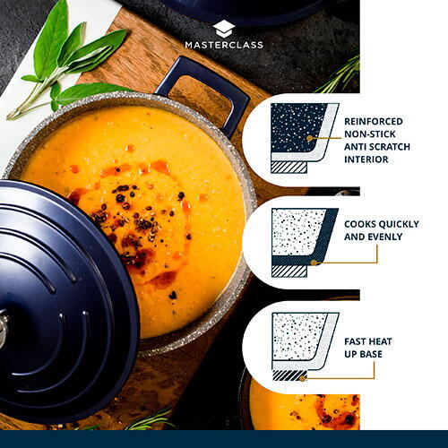 Topkvalitets MasterClass letvægts gryde, der er fremstillet i støbt aluminium, fra engelske KitchenCraft. Denne robuste gryde leder varmen hurtigt rundt og fordeler den jævnt. Som resultat af det får du en langt hurtigere tilberedningstid i den daglige madlavning og bunden i rustfrit stål sikrer, at du kan benytte den på enhver kogeplade. Yderligere forsynet med ekstremt ridsefast 2-lags belægning.