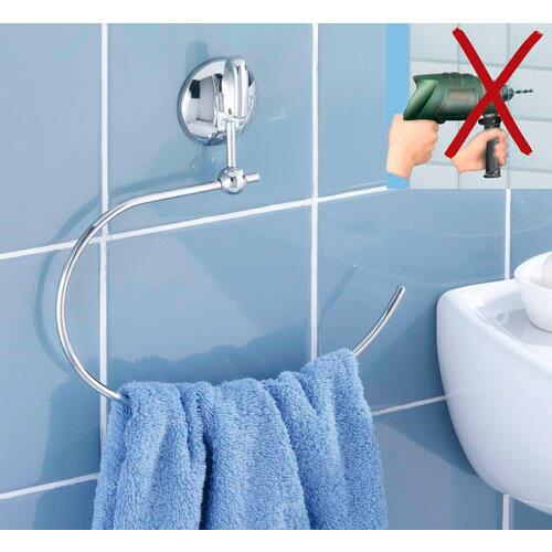 Smart håndklædering i moderne krom design fra tyske Wenko. Håndklæderingen fastgøres med den medfølgende sugekop helt uden at bore. Det er en god idé at afrense området, hvor sugekopper skal hæfte, for evt. kalk og sæbeaflejringer inden opsætning. Klæber perfekt på glas, fliser og andre glatte overflader.