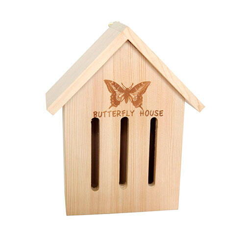 Sommerfuglehus til ophæng med tre indgange til sommerfugle, som vil hjælpe dig med at bibeholde en sund økobalance i haven. Fremstillet i 100% FSC-certificeret fyrretræ. Sommerfuglehuset placeres tæt på pollenbærende træer, blomster og krydderurter og gerne i en højde på mellem 1,5-2 meter over jorden, hvor insekterne trives bedst. Placer gerne insektboet et sted, hvor det kan få meget sollys og knap så meget vind og regn. Du bør ikke lakere eller male sommerfuglehuset, da det kan være til fare for insekterne.