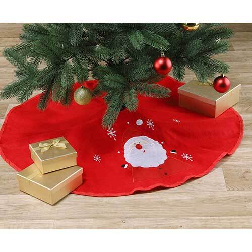Klassisk og dekorativt juletræstæppe med motiv. Fremstillet i 100% polyester og forsynet med julemand og snefnug.