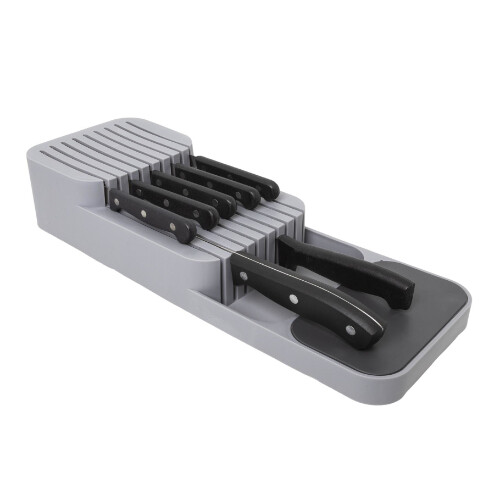 Praktisk knivblok til skuffe, der er fremstillet i robust mellem grå plast med sort støttepude, så knive ikke skrider og larmer. Yderst praktisk tilføjelse til din køkkenskuffe, hvor du kan få gemt knivene væk fra køkkenbordets overflade og spare plads på selve bordpladen. Holderen er forsynet med 18 huller og passer både til små og store knive. Knive medfølger ikke.