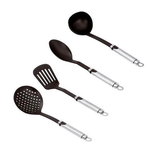 Alsidigt sæt med fire køkkenredskaber fra østrigske Bergner. Fremstillet i rustfrit stål og plast, mens sættet indeholder en grydeske, palet, øse og hulske. Redskaberne er nemme at rengøre, da de tåler opvaskemaskine.
