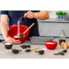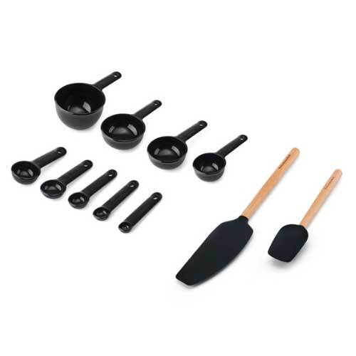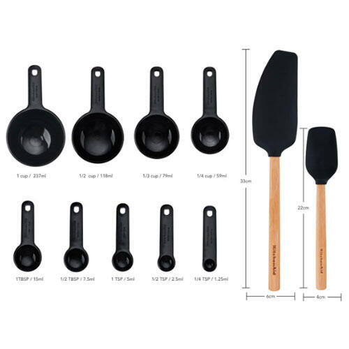 Kvalitets bagesæt, der indeholder to forskellige måleskesæt, en dejskraber og en grydeske. Sættet med 11 dele kommer fra det velkendte og kvalitetsstemplede KitchenAid. Måleskesættene er fremstillet i BPA frit plast og køkkenredskaberne er fremstillet i en blanding af silikone og bambus. Silikonen er varmeresistent op til 260 grader.