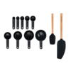Det ene måleskesæt indeholder 4 skeer, der kan indeholde hhv. 59 ml., 79 ml., 118 ml. og 237 ml. Det andet måleskesæt indeholder 5 skeer, der hhv. svarer til 1/4 teske, 1/2 teske, 1 teske, 1/2 spiseske og 1 spiseske. Begge sæt er særdeles velegnet til opvaskemaskine, hvilket gør dem nemme at rengøre. De er altid nemme at finde i skuffen, da de kan sættes sammen i en plastik ring.