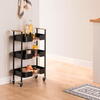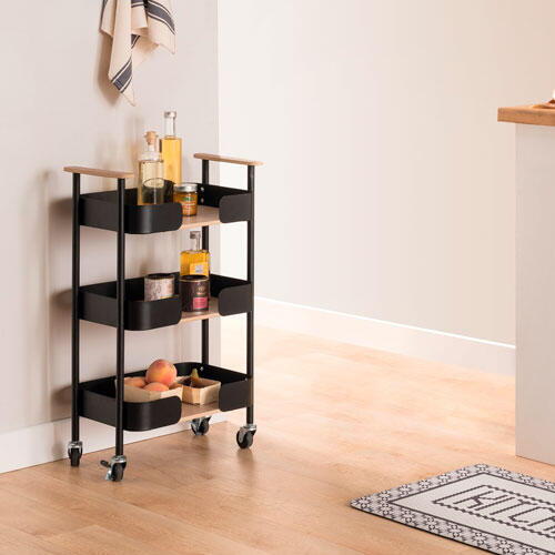 Pladsbesparende Blackwood køkkenvogn i attraktivt design, der er fremstillet i en blanding af MDF træ og metal med sort pulverlakering, fra franske 5five. Køkkenvognen er forsynet med tre hylder med høje kanter, der indrammer hylderne på elegant vis. Yderligere forsynet med fire hjul, hvoraf to af dem har bremsefunktion. Velegnet til brug i køkkenet, på terrassen, ved grillen m.m.