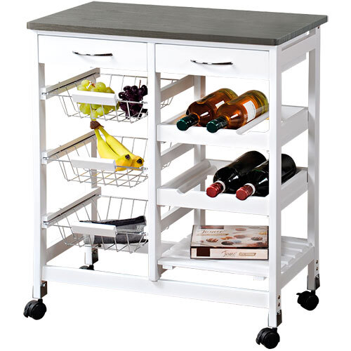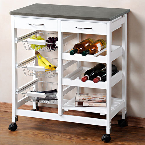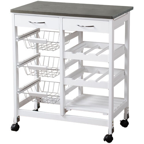 Smart og pladsbesparende køkkenvogn i skandinavisk design, der er fremstillet i 100% FSC-certificeret MDF træ med hvid lakering og kommer fra tyske Kesper. Køkkenvognen er forsynet med tophylde, to udtræksskuffer, tre kurve, to hylder til vinflasker, aflægningshylde og fire hjul, hvoraf to af dem har bremsefunktion. Velegnet til brug i køkkenet, på terrassen, ved grillen m.m.