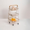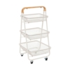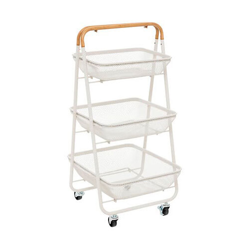 Pladsbesparende og smart universalvogn i tidløst design, der kommer fra franske 5five. Vognen er fremstillet i robust metal med hvid pulverlakering og træhåndtag øverst. Vognen er forsynet med tre kurve med trådnet, samt fire hjul hvoraf to af dem har bremsefunktion. Flot kombination af praktisk funktionalitet og design i et. Kan benyttes som badeværelsesvogn, køkkenvogn og i mange andre af boligens rum. Hurtig og nem at samle og kan benyttes til mange forskellige typer af opbevaring i boligen.