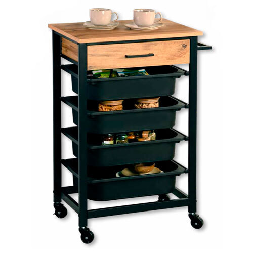 Pladsbesparende køkkenvogn i attraktivt design, der er fremstillet i robust, 100% FSC-certificeret bambus med sort lakering og egetræs laminat, der kommer fra tyske Kesper. Køkkenvognen er forsynet med tophylde, udtræksskuffe, fire udtræksbakker og fire hjul, hvoraf to af dem har bremsefunktion. Velegnet til brug i køkkenet, på terrassen, ved grillen m.m.