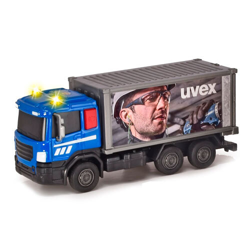Underholdende City Team legetøjslastbil, der er udstyret med lys og lyd. Lastbilen er fremstillet i robust metal og plast, der kommer fra Dickie Toys. Man kan aktivere lys og lyd ved at trykke på knappen på siden af førehuset, hvilket er til stor underholdning for husets mindste. 3 x 1,5 V LR44 batterier medfølger.