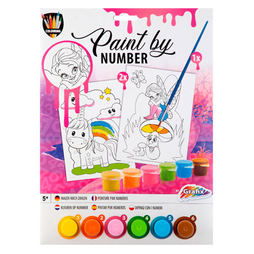 Kreativt Paint by number sæt fra Grafix, der lader dit barn farvelægge 2 forskellige ark med tilhørende maling og pensel. Arkene er forsynet med nummerering i alle felter og det samme er beholderne med maling. Dit barn kan derfor matche numrene på arkene med numrene på malingen for at farvelægge tegningerne. Sættet er egnet til børn, der er ældre end 5 år.