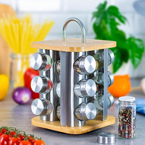 Lækre krydderier giver mange retter deres særlige charme og Klausberg har gjort det nemt for dig at opbevare dine krydderier her. Nu kan du nemlig få en moderne krydderikarrusel med 12 glas til opbevaring af forskellige krydderier. Fremstillet i en blanding af bæredygtigt, miljøvenligt og 100% FSC-certificeret bambus og solidt rustfrit stål, der er forsynet med drejbar fod og robuste krydderiglas.