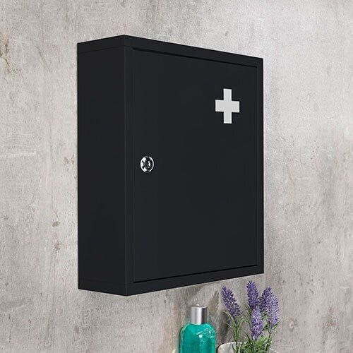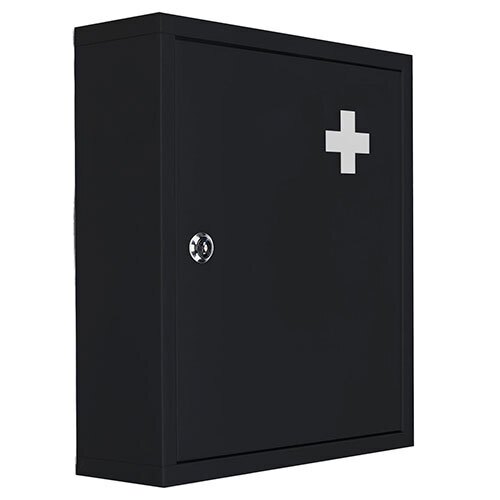 Kvalitets medicinskab, der er fremstillet i 0,6 mm. tykt stål med pulverlakering i sort. Lågen er forsynet med kors på ydersiden og har en lås med 2 nøgler. Dette robuste medicinskab er udstyret med en fastmonteret hylde. Skabet er ikke kun beregnet til at bringe orden i badeværelset, entré eller kontor, men samtidig en sikker og ordentlig måde til opbevaring af medicin m.m. Skabet placeres solidt på væggen, uden for børns rækkevidde. Yderst velegnet til både privat og professionel brug på badeværelset, kontoret, værkstedet, i sportsklubben m.m.