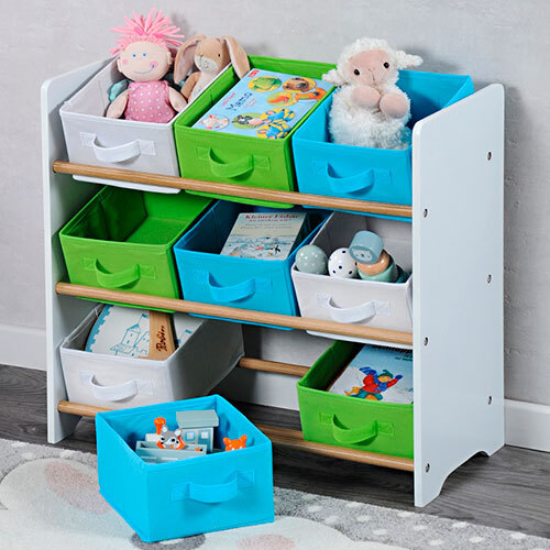 Praktisk og dekorativ børnereol med 9 legetøjskasser til forskellige typer af opbevaring. Stabil reol i god kvalitet, der er fremstillet i 100% FSC-certificeret MDF træ med hvid lakering. Hurtig og nem at samle. Kommer fra tyske Kesper.