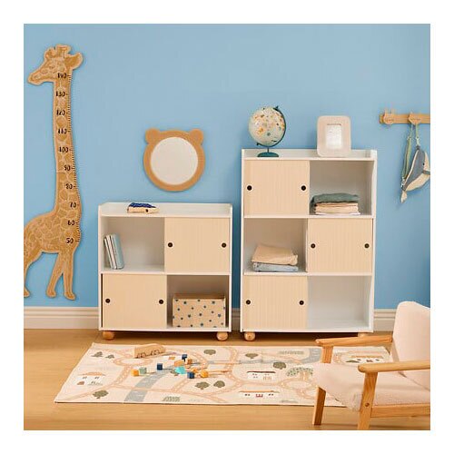 Kvalitets Bouli reol til børneværelset i flot design, der er fremstillet i 100% FSC-certificeret MDF træ med hvid og beige lakering, som kommer fra franske Atmosphera. Reolen er forsynet med tophylde og 4 rum, der giver en optimal kombination af funktionalitet og design i et. Reolen er ligeledes forsynet med 2 skydelåger og hver hylde tåler maksimal belastning på ca. 5 kg. Pynter på ethvert børneværelse med dens minimalistiske design og nyttige opbevaringsplads.