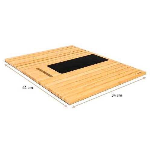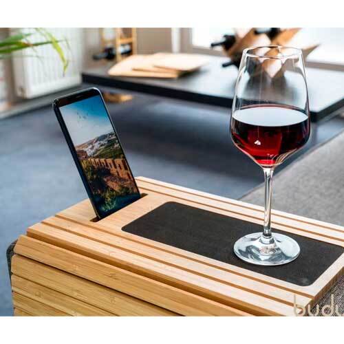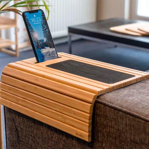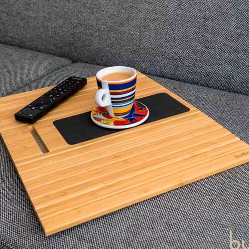 Praktisk og funktionel armlænsbakke til sofa fra hollandske Budu. Fremstillet i bæredygtigt, miljøvenligt og 100% FSC-certificeret bambus, der er forsynet med skridsikker underside. Udstyret med holder til smartphone, samt plade til glas.