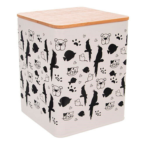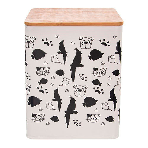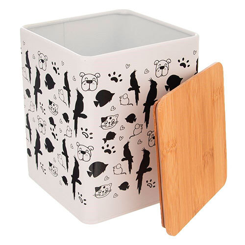 Praktisk beholder til dyrefoder, der kommer fra tjekkiske Orion. Fremstillet i robust metal med hvid lakering og sort print med dyr. Låget er lufttæt og så er det fremstillet i bæredygtigt og miljøvenligt bambus. Kan eksempelvis benyttes til fuglefoder, fedtkugler, kattefoder eller hundefoder. Beholderen sørger for, at indholdet holder sig frisk i længere tid.