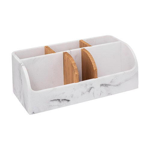 Pladsbesparende organizer med seks rum, der er fremstillet i robust polyresin med marmor look og bambus skillevægge. Kommer fra franske 5five og yderst velegnet til forskellige typer af opbevaring i boligen. Kan eksempelvis benyttes til opbevaring af makeup på badeværelset eller til kontorartikler.