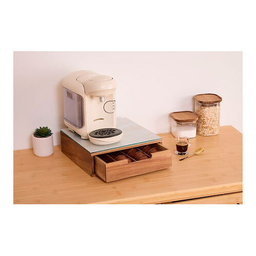 Smart og praktisk opbevaringsæske til alle dine te- eller kaffekapsler. Æsken er fremstillet i 100% FSC-certificeret akacietræ og forsynet med beige glastop. Forsynet med udtræksskuffe med fire rum til kapsler. Kan rumme op til 56 Nespresso kapsler eller 20 Dolce Gusto kapsler. Kommer fra franske 5five.