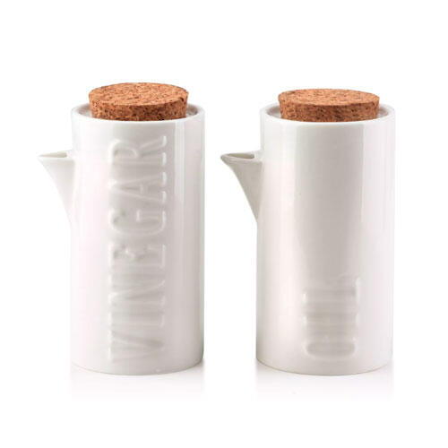 Kvalitets olie- og eddikesæt, der er fremstillet i solidt porcelæn med korklåg. Kommer fra Mondex og egner sig til at stå på både køkken- og spisebord. Tåler opvaskemaskine, hvis korkpropperne fjernes.
