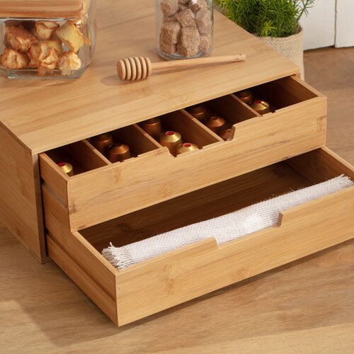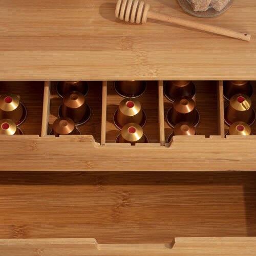 Smart og praktisk opbevaringsæske til alle dine te- eller kaffekapsler. Æsken er fremstillet i 100% FSC-certificeret, bæredygtigt og miljøvenligt bambus. Forsynet med to udtræksskuffer, hvoraf den øverste har fem rum til kapsler, tebreve og andre småting og nedre skuffe er et stort rum.