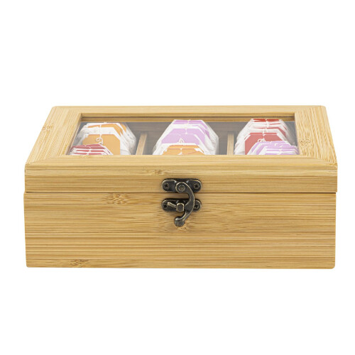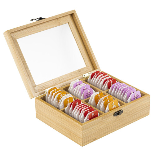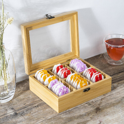 Praktisk opbevaringsæske til alle dine tebreve fra tyske Chefware. Æsken er fremstillet i bæredygtigt og miljøvenligt bambus og forsynet med transparent akryl låg og bambus look melamin bund. Låget er udstyret med hængsler, så det er let at åbne og lukke låget.