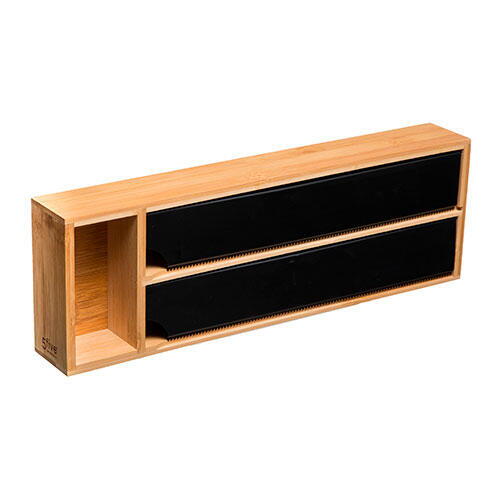 Smart og praktisk foliebakke med skær i bæredygtigt, miljøvenligt og FSC-certificeret bambus. Forsynet med to rum med tilhørende skær og et opbevaringsrum til småting såsom klemmer el.lign. Anvendelig til staniol, bagepapir, folie m.m. Produceret hos franske 5five.