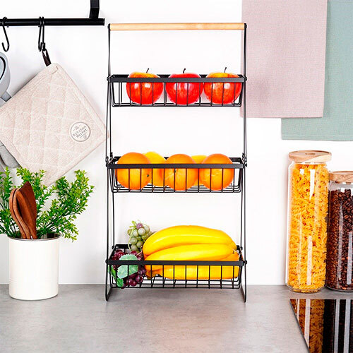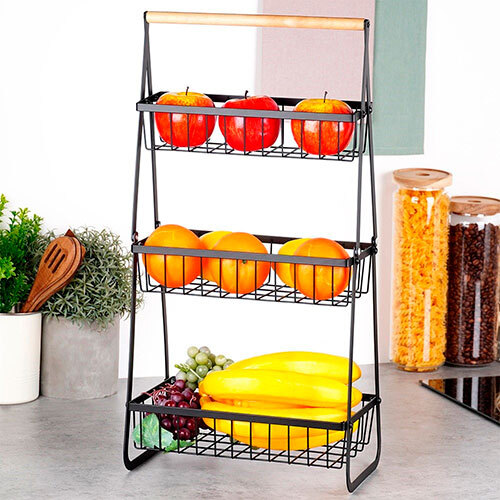 Frugtkurv i metal m/ træhåndtag - Sort | 3 etager