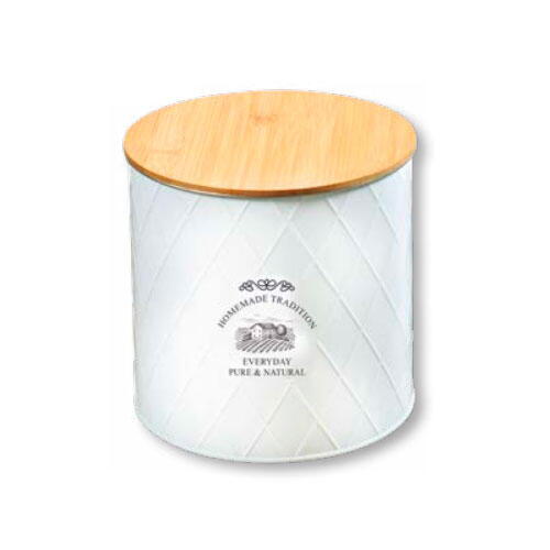 Retro opbevaringsdåse, der er fremstillet i robust stål med mønster, tekstmotiv og hvid lakering. Bambuslåget er 100% FSC-certificeret og lukker tæt sammen for at bevare friskheden og smagen længst muligt. Anvendelig til forskellige typer af opbevaring i køkkenet og beholderen kommer fra tyske Kesper.