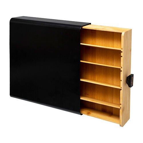 Smart og praktisk Natureo opbevaringsæske til alle dine te- eller kaffekapsler. Æsken er fremstillet i en blanding af metal og bæredygtigt og miljøvenligt bambus. Forsynet med udtræksskuffe med håndtag og fire rum til kapsler. Rumdelerne er justerbare og passer derfor til forskellige fabrikanter.