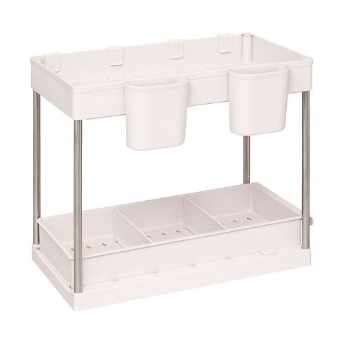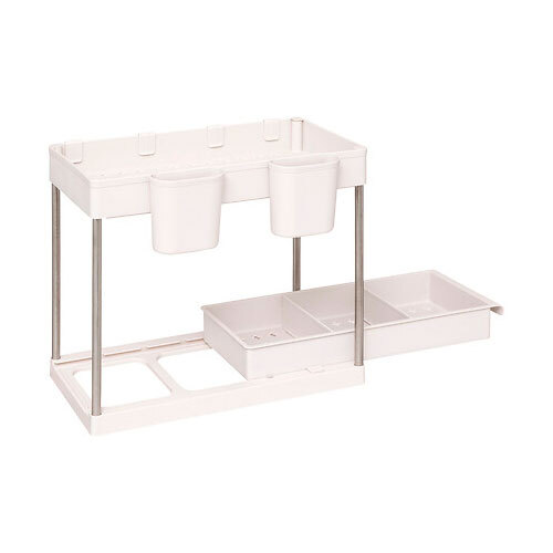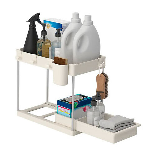 Genial organizer med to etager til dine køkkenskabe eller andre skabe, der sørger for et væld af opbevaringsmuligheder. Fremstillet i en blanding af metal og PP-plast i beige farve. Kommer fra franske 5five og gør det nemt for dig at skabe ekstra plads lige der, hvor du står og mangler det. Kan også benyttes til opbevaring af rengøringsmidler i bryggersskabet og meget andet. Forsynet med fire flytbare kroge til ophæng af diverse ting og så er den nederste etage forsynet med smart udtrækshylde.