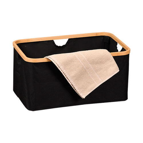 Smart og rummelig opbevaringskurv, der er flot udført med bambusramme og sort stof i genbrugs polyester. Ideel til opbevaring af håndklæder på badeværelset eller vasketøj, da den er forsynet med stort opbevaringsrum. Bambusrammen er 100% FSC-certificeret. Kan foldes sammen når den ikke er i brug så den fylder mindre.