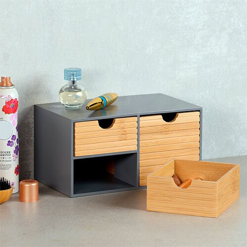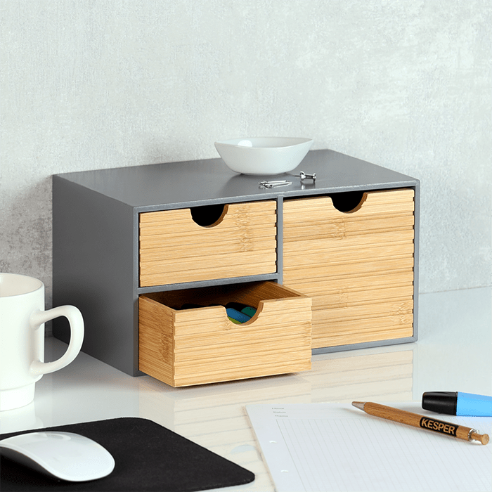 Pladsbesparende Pure Line organizer med tre skuffer, der er fremstillet i en blanding af MDF træ og 100% FSC-certificeret, bæredygtigt og miljøvenligt bambus. Kommer fra tyske Kesper og er yderst velegnet til forskellige typer af opbevaring i boligen. Kan eksempelvis benyttes til opbevaring af makeup på badeværelset eller til kontorartikler.