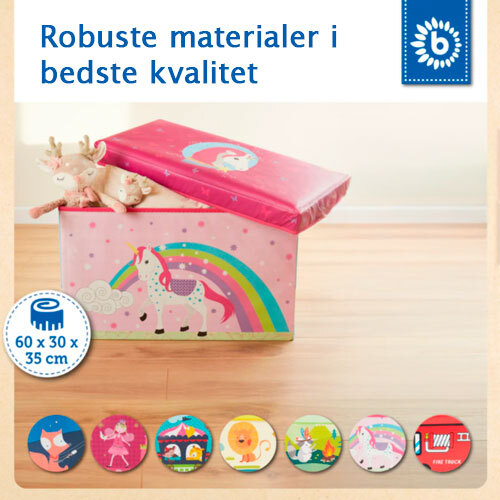 Smart legetøjskasse med siddeplads på toppen i rigtig god kvalitet, der kommer fra tyske Bieco. Stabil opbevaringskasse med god plads, der er fremstillet i MDF træ i siderne med blød og behagelig belægning og med blød og komfortabel siddeplads på toppen. Med denne legetøjskasse bliver oprydningen lidt sjovere. Hurtig og nem at folde sammen igen, hvis den skal gemmes væk i skabet, når den ikke er i brug. Legetøjskassen er ligeledes testet fri for skadelige stoffer. Den tåler maksimal belastning på ca. 80 kg. ved centreret tryk på låget.