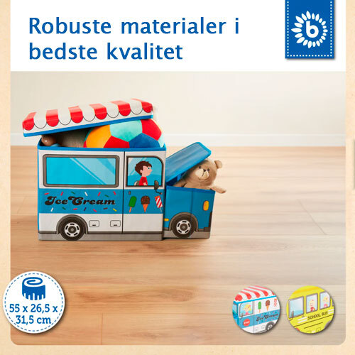 Smart legetøjskasse med siddeplads på toppen i rigtig god kvalitet, der kommer fra tyske Bieco. Stabil opbevaringskasse med god plads, der er fremstillet i MDF træ i siderne med blød og behagelig belægning og med blød og komfortabel siddeplads på toppen. Med denne legetøjskasse bliver oprydningen lidt sjovere. Hurtig og nem at folde sammen igen, hvis den skal gemmes væk i skabet, når den ikke er i brug. Legetøjskassen er ligeledes testet fri for skadelige stoffer. Den tåler maksimal belastning på ca. 80 kg. ved centreret tryk på låget.