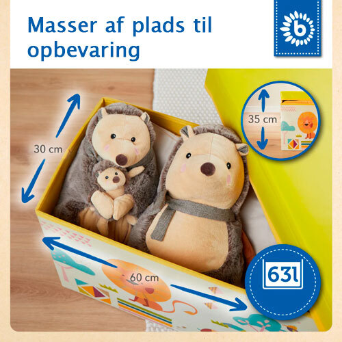 Legetøjskassen måler ca. (H x B x D) 35 x 60 x 30 cm. Vejer ca. 2 kg. og rummer op til 63 L.