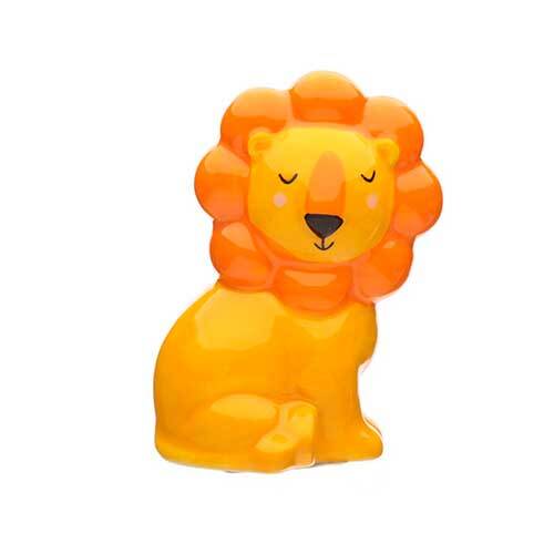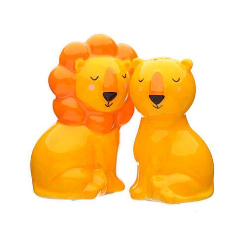 Dekorativt salt- og pebersæt med løvepar, der er fremstillet i keramik med blank glasur.