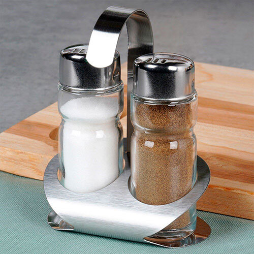 Nydeligt Orion salt- og pebersæt, der er fremstillet i robust glas med fin holder i stål. Sættet består af to beholdere til salt og peber, samt en minimalistisk holder med stålhåndtag til at placere beholderne i.