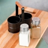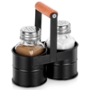 Nydeligt salt- og pebersæt, der er fremstillet i robust glas med holder i metal med sort pulverlakering. Sættet består af to beholdere til salt og peber, samt en dekorativ holder med træhåndtag til at placere beholderne i. Hver beholder rummer op til ca. 80 ml.