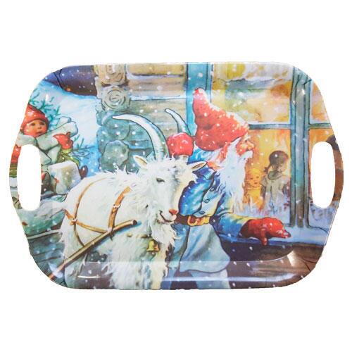 Praktisk serveringsbakke med dekorativt nisse motiv, der er tegnet af Jenny Nyström. Bakken er fremstillet i melamin. På bakken kan du placere dine julegodter og varme drikke, hvor du nemt kan transportere det fra sted til sted. Bakken er udstyret med bærehåndtag og nem at rengøre efter brug.