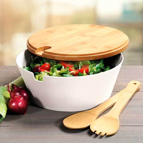 Kvalitets frugt-og salatskål i melamin plast med træbestik i bambus. Låg og bestik er fremstillet i bæredygtigt og miljøvenligt bambus med FSC-certifikat. Nydeligt sæt til servering på bordet. Skålen tåler opvaskemaskine.