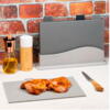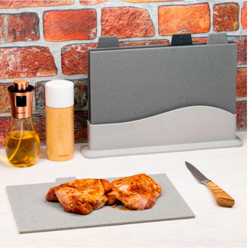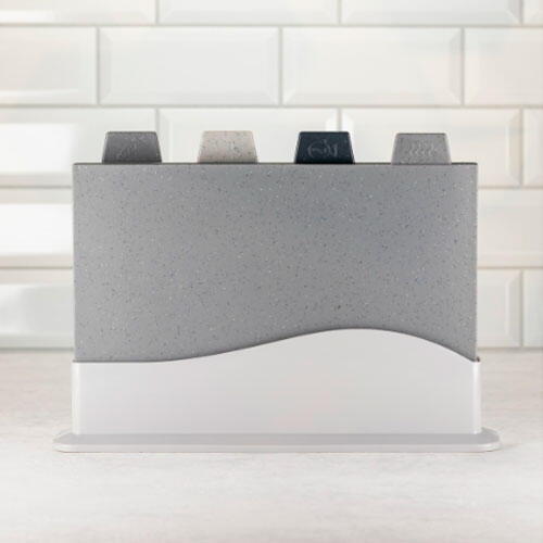 Hygiejnisk skærebrætsæt med 4 skærebrætter i forskellige grå farver og symboler, der nemt tages op og sættes i igen i den medfølgende stander. På denne måde kan du hurtigt og nemt skifte skærebræt afhængigt af, hvad du står og skal tilberede i køkkenet. Alle dele tåler ligeledes opvaskemaskine.